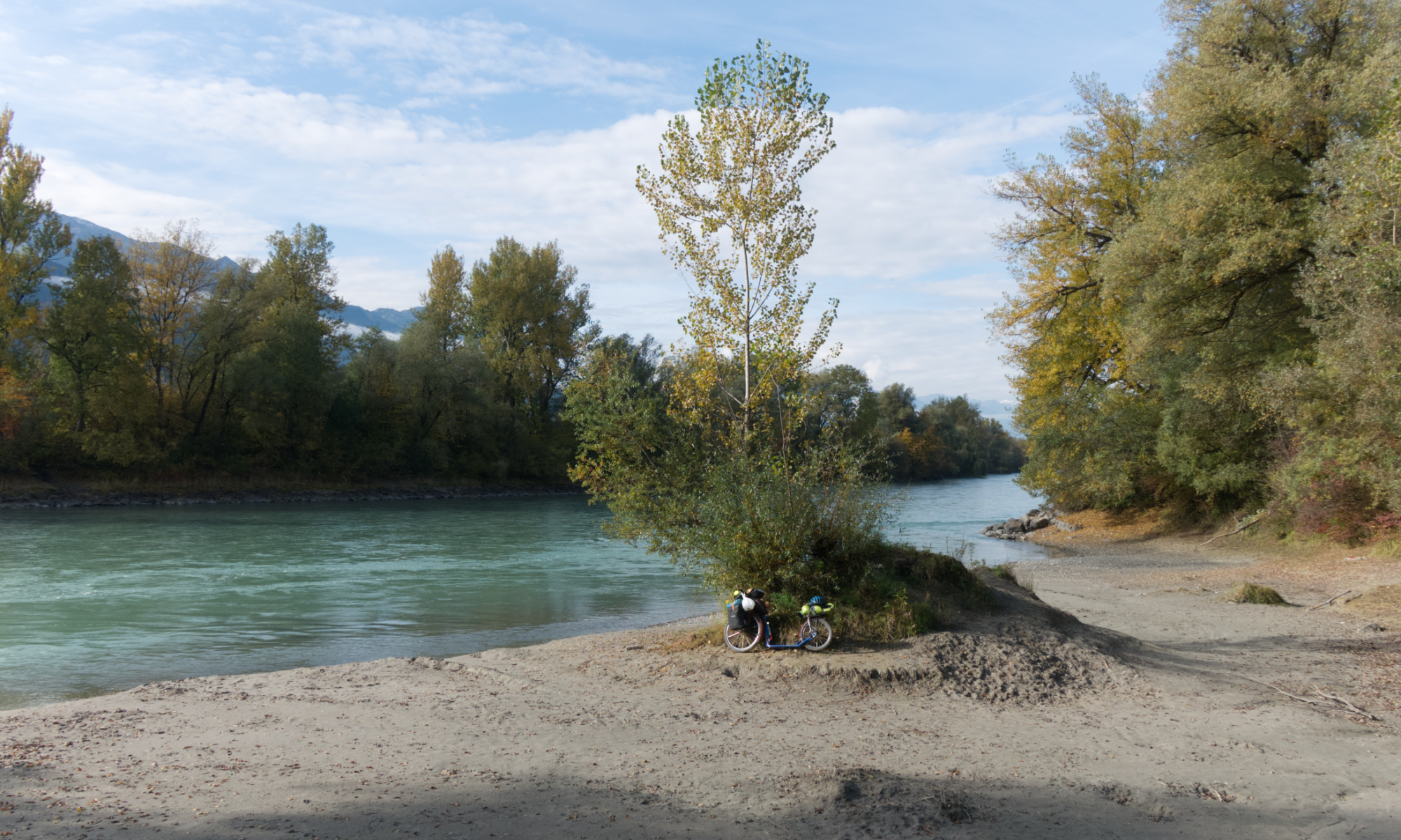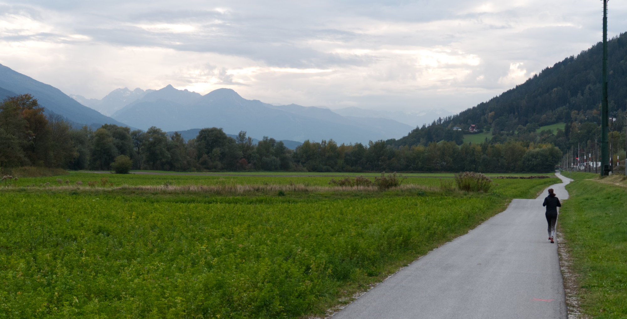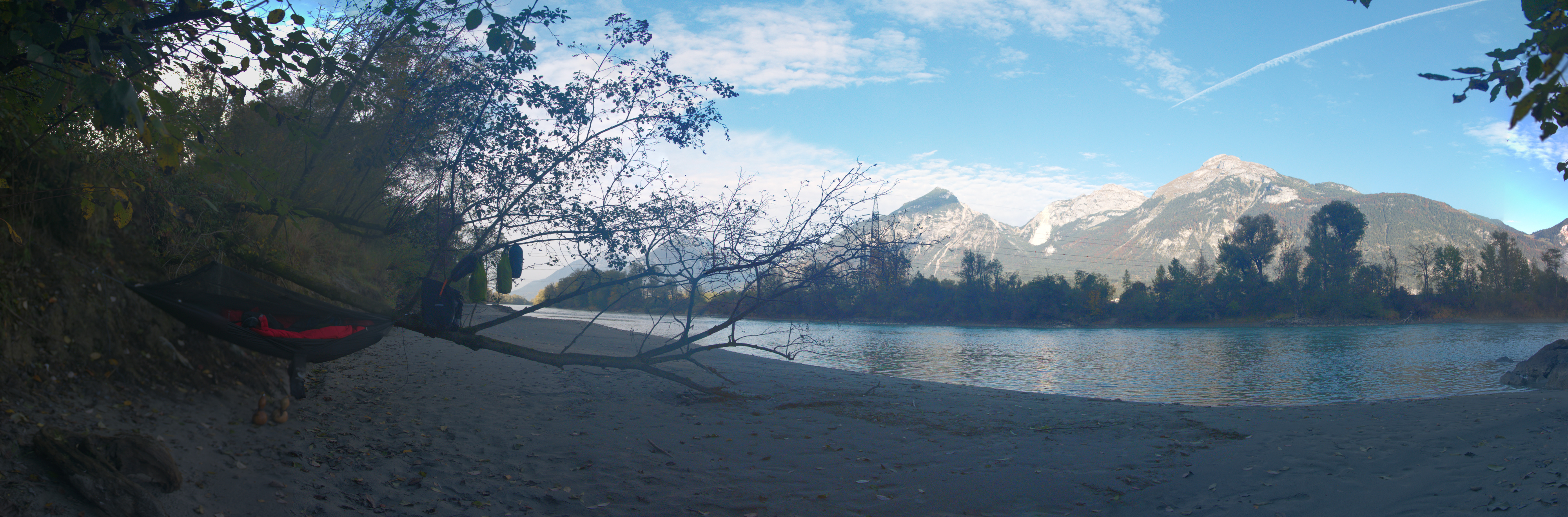 Thirty kilometers before Rosenheim I reached the river Inn. Once you reached the Inn, it is super easy, to follow the gravel road along its shore for the next 200 kilometers. I had one and a half days of foggy weather that made it impossible to see the Alps in the distance. This was one of my first impressions of the Inn-Cycleway on the evening.The Alps suddenly came out of the foggy wheather, when I was quite close and they were all the more mighty as a sight then. I always admire these mountains that suddenly spring up like a three dimensional wall in the otherwise flat land*. (Quick reference: * = not to be confused with flatland. However, the Alps might be equally unimaginably in their additional height dimension for beings of such flat lands as Northern Germany. 😉 )In general I leave panoramas in higher resolution here in the blog. So if you click on it, you may look at them in much bigger sizes. For most other pictures I just use 2000 pixels as the widest edge, for panoramas I use 3000, 4000 or 5000 – just that you can enjoy them closer.I like the winding path and the jogger just came in the right moment to emphasize it a bit. Of the twenty pictures taken, also with a passing cyclist, this here had the best perspective with another person. It is always a bit more difficult if other people just do what they do and move and you want to have the best shot. 😉Kind of the same as the last one, but taken many miles apart. Horse riders are always cool in pictures. Talking about animals, I found this sheep race intriguingly funny.Going from one funny face to the next. It happened that when I crossed this place that it was Sunday in October and that THE parachuting club of Tyrol had one of their three yearly jumping days and festivities beside my path. I went over for some pictures, some cake, a chat and even got a parachuting stamp in my pilgrim stamp booklet. If this vertical panorama is not shown in size width, if you click on it it should be in full size anyway. Some of the towns maybe 50km into the Inn valley in Austria.I visited a small chapel here and discovered that the passage provided a nice light situation. I also had a chat with some people there about the kickbiking and my journey. On average I have two such conversations every day. 🙂 Some people are just in awe, some might get inspired – the first one is funny to watch, the second is a thing I really like to do.Gosh, what a massive panorama this was. It took probably 20 pictures. Often I just take one or two pictures in churches, but here a really wide and high panorama was nice to represent the church decently.Outside of a Karmelite church, which is now a museum, these nicely colored plants forced me to take an autumn picture.A particularly nice camping site here. Right into the slope of some tiny forest bit.The camp on the last picture was on the right edge of this shot. Roughly behind the odd darker spot there that looks like a snake that has eaten a small elephant. I found it really difficult to find good sleeping spots in the Inn valley! Mainly because this is the main truck route from Italy to Germany and the highway is always in hearing distance. The only question is how terribly close it should be this night. At this spot I already did not care anymore that it was quite loud, because I got used to from the three nights before. Ignorance is bliss and I was then happy to enjoy the scenery, sand and water.Another camping ground directly beside the Inn. Very nicely looking location – within highway hearing distance of course.
