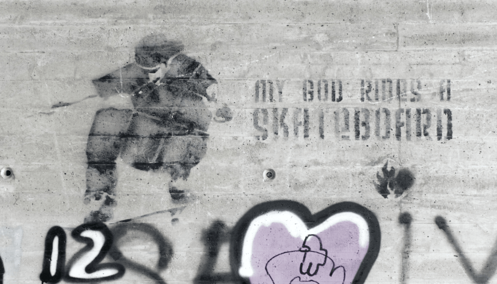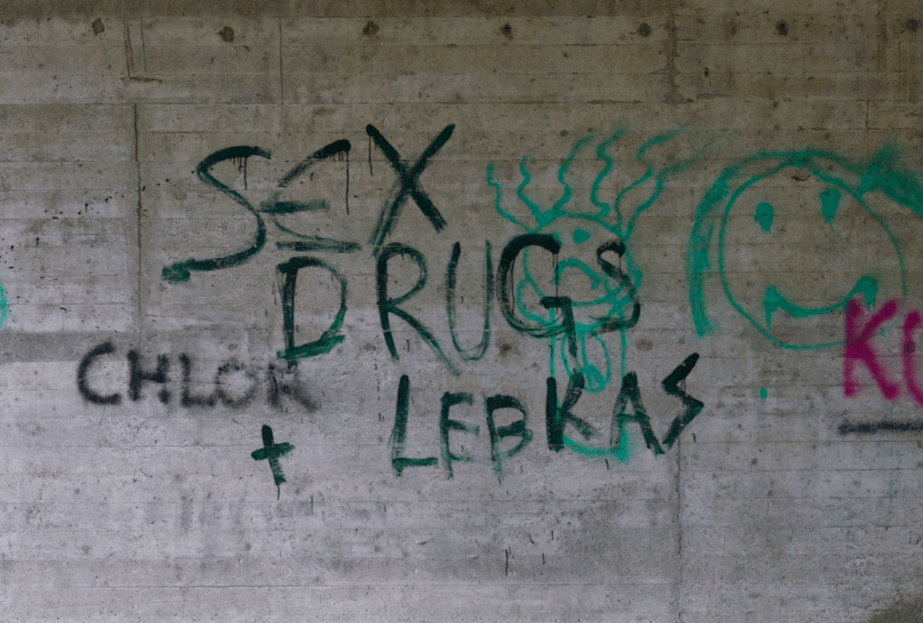 Kind of cool. I mean, who does all the work and cut out a complicated stencil if he*she would take this serious? „My god rides a skateboard“ also reminded me of Silvia Mittermüller*, who probably has a god on a snowboard but nevertheless travels on holidays through towns on a skateboard. *a very admirable woman, that I meet every now and then since my kickbike tour to the Zugspitze. Last time I visited her in hospital, when her dislocated elbow was just operated and a day later I dropped in for her birthday to bring her a small gift. And from her mother I got a wooden spoon that I use now since three months to eat musli on my journey. I wanted to meet Silvia just quickly in the morning, but then she had the first sporty flow session since she damaged the elbow and wished absolutely no disruption, but that I could leave my present with her mum. Well, I and her mum were chatting happily away then for the next hour until Silvia appeared and I left maybe after three hours. 🙂 So much about skateboards, snowboards, Silvia and my wooden pilgrim spoon.A random, true graffiti.Sometimes I am not sure how serious graffiti are. Maybe this actually is very serious! And no, the „Chlorine“ is from a different sprayer and has hopefully nothing to do with personal favorite activities.