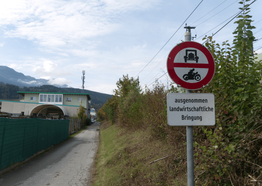 I had a food break at the start of Schwaz and happened to go through a leaflet at an infoboard „who fixes what in Schwaz“ and found there is a bike shop called „Zur rostigen Gurke“ „To the rusty cucumber“. In German one may call an old vehicle „Rostgurke“. I needed new brake pads anyway and thought it is ten times funnier having them from this shop than any normal one. For random coincidence it also had open: because it had a sign outside that it is closed due to illness – but an elderly man stood outside and told me that it should be open today (wherever he had this information from), so I told him that it would only be opened in 40 minutes as the opening hours said, but he said that it should be earlier. Well, I actually did not want to wait for 40 minutes just for break pads, but I thought I could wait at least for a few minutes. And, after 5 minutes the owner came and opened the shop. After he finished the elderly man’s bike, I went in and got my break pads. And I asked him also for a stamp into my pilgrim stamping booklet. So I have one of the funniest bike shop stamps now in there as well. 🙂This happens when Noah is allowed to give street names. He comes out after 40 days of flooding, calling the first one „to the ark“ (well, the „r“ is missing, but some German dialects would not pronounce it a lot, so I think it counts) and the second one „far nice“I especially liked that this sign shows a car that looks as modern as the Ford Model T. 🙂I often take pictures of graffiti. They are often funny, often good craft and sometimes absurd. I liked this one a lot.